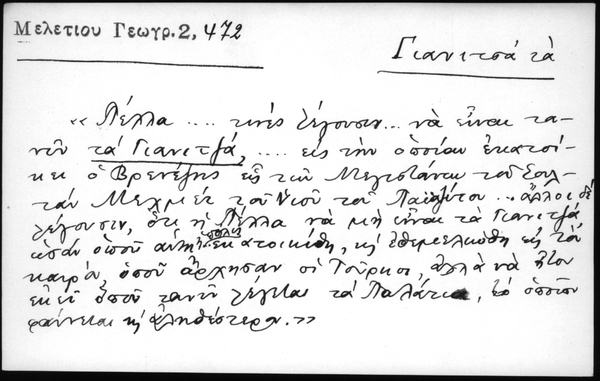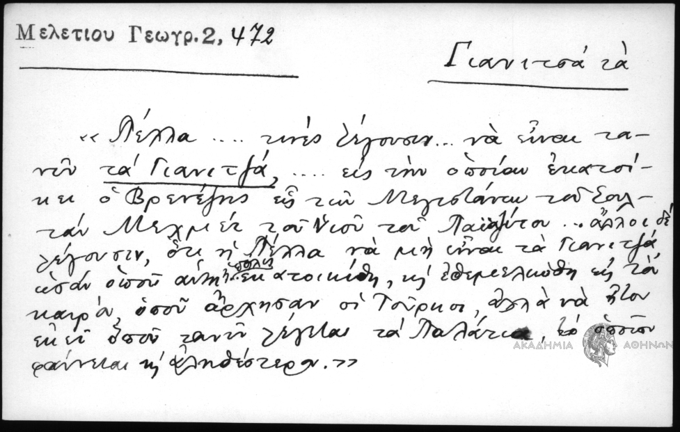 - "Πέλλα... τινές λέγουσιν... να είναι τανύν τα Γιανιτζά, ...εις την οποίαν εκατοίκει ο Βρενέζης εις των Μεγιστάνων του Σουλτάν Μεχμέτ του υιού του Παϊαζίτου... άλλοι δε λέγουσιν, ότι η Πέλλα να μη είναι τα Γιανιτζά ωσάν οπού αυτή η πόλις εκατοικήθη, και εθεμελιώθη εις τον καιρόν οπού άρχησαν οι Τούρκοι, αλλά να ήτον εκεί οπού τανύν λέγεται τα Παλάτια, το οποίον φαίνεται και αληθέστερον"¨.