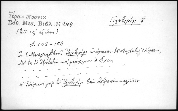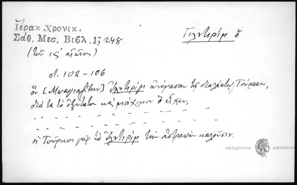 - στ. 102 - 106 ον [Μπαλιαζίτην] Ιλντιρίμ ωνόμασαν τη διαλέκτω Τούρκων, δια τε το οξύτατον και μάχιμον ο είχεν, ... οι Τούροι γαρ το Ιλντιρίμ την αστραπή καλούσιν.