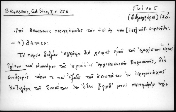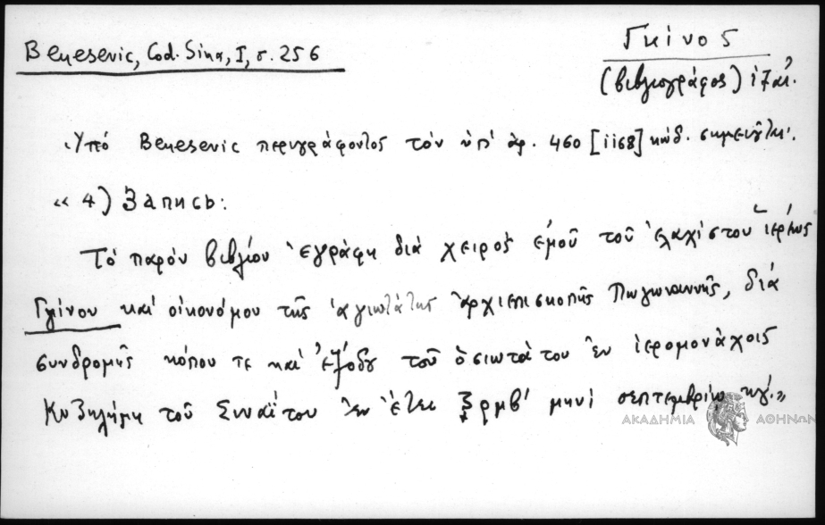- Υπό Benesevic περιγράφοντος τον υπ' αρ.460[1168] κώδ. σημειούται: "4) [...]: Το παρόν βιβλίον εγράφη διά χειρός εμού του ελαχίστου ιερέως Γγίνου και οικονόμου της αγιωτάτης αρχιεπισκοπής Πωγωιαννής, διά συνδρομής κόπου τε και εξόδου του οσιωτάτου εν ιερομονάχοις Κυζκλήμη[?] του Σιναΐτου εν έτει ζρμβ΄ μηνί σεπτεμβρίω κγ΄."