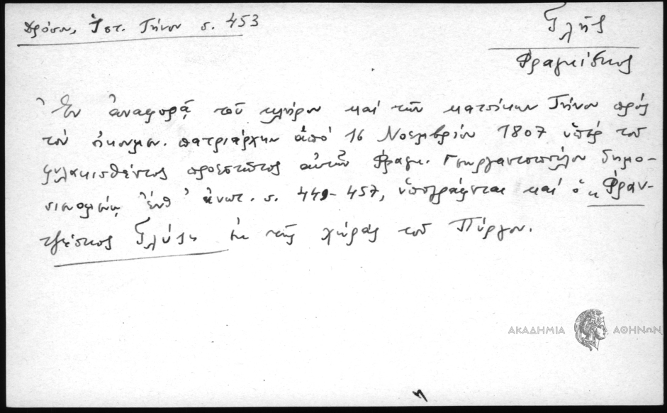 - Εν αναφορά του κλήρου και των κατοίκων Τήνου προς τον οικουμεν. πατριάρχην από 16 Νοεμβρίου 1807 υπέρ του φυλακισθέντος πρεστώτος αυτών Φραγκ. Γεωργαντοπούλου δημοσιευομένω ενθ' ανωτ. σ.449-457, υπογράφεται και ο "Φραντζέσκος Γλύς" εκ της χώρας του Πύργου.
