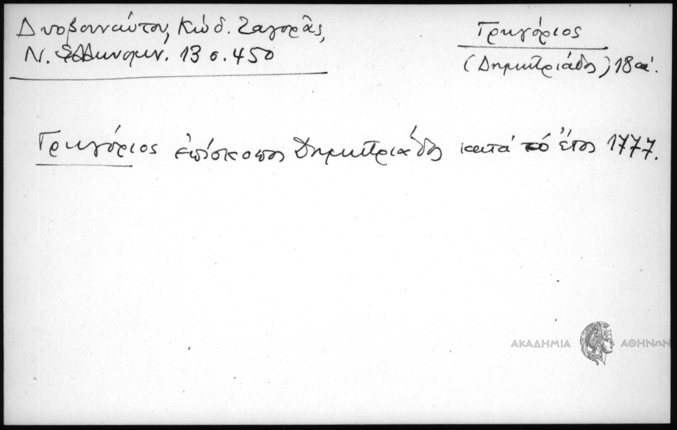 - Γρηγοριος επίσκοπος Δημητριάδος κατά το έτος 1777