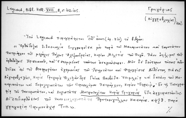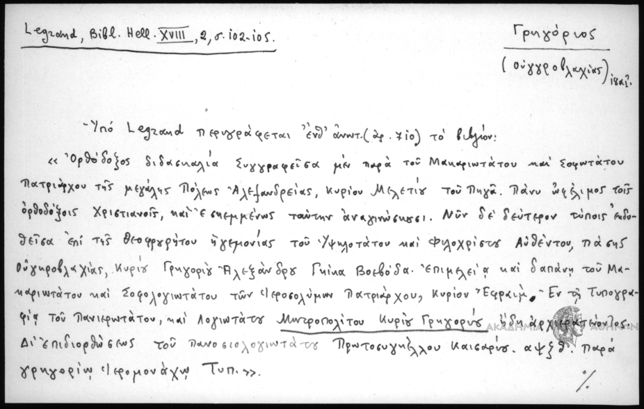 - Υπό Legrand περιγράφεται ένθ΄ ανωτ. (αριθ. 1124) το βιβλίον: "Ορθόδοξος διδασκαλία Συγγραφείσα μεν παρά του Μακαριωτάτου και Σοφωτάτου Πατριάρχου της μεγάλης Πόλεως Αλεξανδρείας, κυρίου Μελετίου του Πηγά. Πάνυ ωφέλιμος τοις ορθοδόξοις Χριστιανοίς, και εσκεμμένως ταύτην αναγινώσκουσι. Νυν δε δεύτερον τύποις εκδοθείσα επί της θεοφρουρήτου ηγεμονίας του Υψηλοτάτου και Φιλοχρίστου Αυθέντου, πάσης Ουγκροβλαχίας, Κυρίου Γρηογρίου Αλεξάνδρου Γκίκα Βοεβόδα. Επιμελεία και δαπάνη του Μακαριωτάτου και Σοφολογιωτάτου των Ιεροσολύμων Πατριάρχου, Κυρίου Εφραίμ. Εν τη Τυπογραφία του Πανιερωτάτου και Λογιωτάτου Μητροπολίτου Κυρίου Γρηγορίου ήδη αρχιερατεύοντος. Δι΄ επιδιορθώσεως του Πανοσιολογιωτάτου Πρωτοσυγκέλλου Καισαρίου αψξθ παρά γρηγορίω ιερομονάχω Τυπ.". Σχ. 4ον, φύλλ. 8 αν. αρ. + τκ΄ (320) σελ. + φύλλ. 2 αν. αρ. [Υπό του Legrand αναδημοσιεύεται ο υπό Νεοφύτου Καυσοκαλυβίτου συνταχθείς πρόλογος του βιβλίου, παρέχων αξιολόγους βιογραφικάς πληροφορίας περί του Μελ. Πηγά]