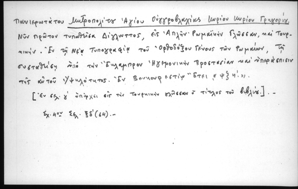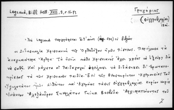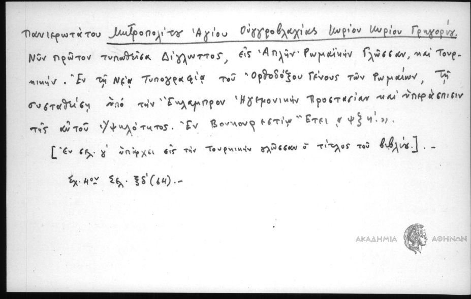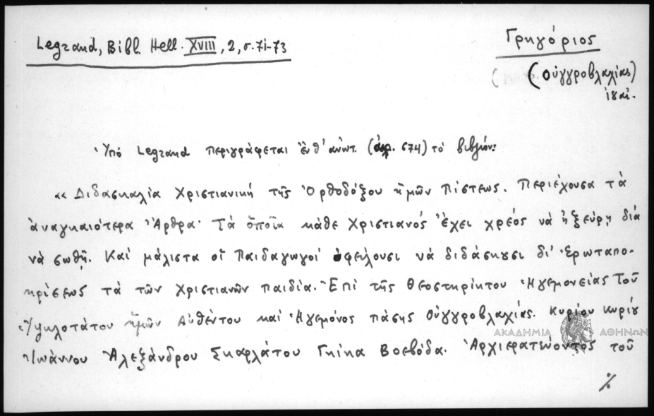 - Υπό Legrand περιγράφεται ένθ΄ ανωτ. (αριθ. 674) το βιβλίον: "Διδασκαλία Χριστιανική της Ορθοδόξου ημών πίστεως. Περιέχουσα τα αναγκαιότερα Άρθρα· Τα οποία κάθε Χριστιανός έχει χρέος να ηξεύρη δια να σωθή. Κα μάλιστα οι Παιδαγωγοί οφείλουσι να διδάσκουσι δι΄ Ερωταποκρίσεως τα των Χριστιανών παιδία. Επί της Θεοστηρίκτου Ηγεμονείας του Υψηλοτάτου ημών Αυθέντου και Ηγεμόνος πάσης Ουγγροβλαχίας, Κυρίου Κυρίου Ιωάννου Αλεξάνδρου Σκαρλάτου Γκίκα Βοεβόδα, Αρχιερατεύοντος του πανιερωτάτου Μητροπολίτου Αγίου Ουγγροβλαχίας Κυρίου Κυρίου Γρηγορίου. Νυν πρώτον τυπωθείσα Δίγλωττος, εις Απλήν Ρωμαϊκήν Γλώσσαν, και Τουρκικήν. Εν τη Νέα Τυπογραφία του Ορθοδόξου Γένους των Ρωμαίων, τη συσταθείση υπό την Έκλαμπρον Ηγεμονικήν Προστασίαν και υπεράσπισιν της αυτού Υψηλότητος. Εν Βουκουρεστίω Έτει αψξη΄". [Εν σελ. γ΄ υπάρχει εις την τουρκικήν γλώσσαν ο τίτλος του βιβλίου] Σχ. 4ον Σελ. ξδ΄ (64)