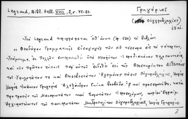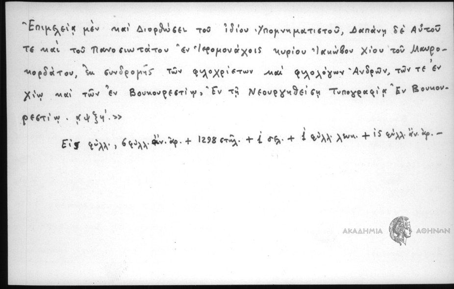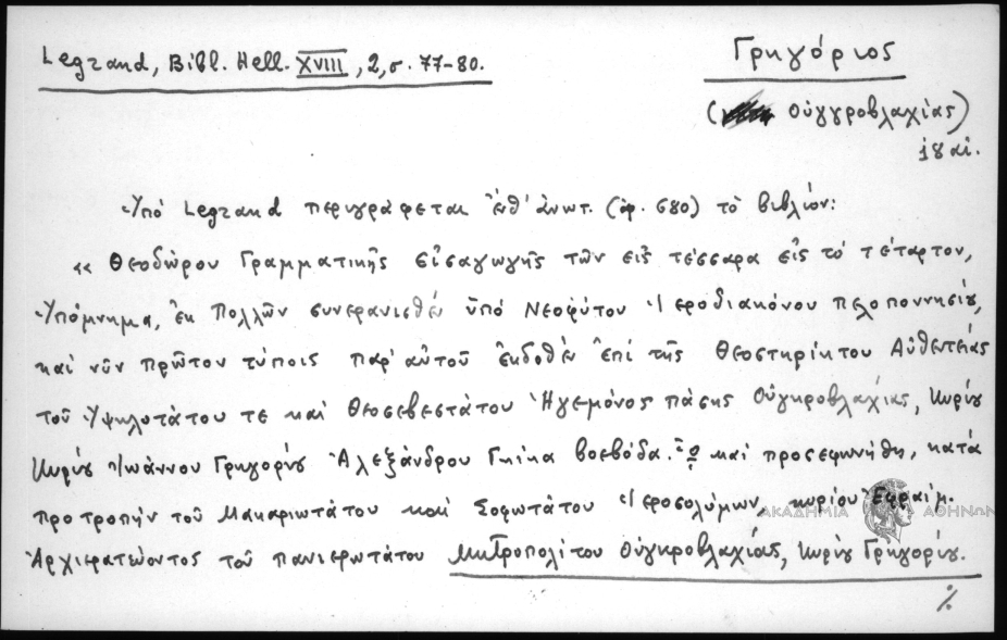 - Υπό Legrand περιγράφεται ένθ΄ ανωτ. (αριθ. 680) το βιβλίον: "Θεοδώρου Γραμματικής Εισαγωγής των εις τέσσαρα εις το τέταρτον, Υπόμνημα, εκ Πολλών συνερανισθέν υπό Νεοφύτου Ιεροδιακόνου Πελοποννησίου, και νυν πρώτον τύποις παρ΄ αυτού εκδοθέν επί της Θεοστηρίκτου Αυθεντείας του Υψηλοτάτου τε και Θεοσεβεστάτου Ηγεμόνος πάσης Ουγκροβλαχίας, Κυρίου Κυρίου Ιωάννου Γρηγορίου Αλεξάνδρου Γκίκα βοεβόδα: Ω και προσεφωνήθη, κατά προτροπήν του Μακαριωτάτου και Σοφωτάτου Ιεροσολύμων, κυρίου Εφραίμ. Αρχιερατεύοντος του πανιερωτάτου Μητροπολίτου Ουγκροβλαχίας Κυρίου Γρηγορίου. Επιμελεία μεν και Διορθώσει του ιδίου Υπομνηματιστού, Δαπάνη, δε Αυτού τε και του πανοσιωτάτου εν Ιερομονάχοις κυρίου Ιακώβου Χίου του Μαυροκορδάτου, εκ συνδρομής των φιλοχρίστων και φιλολόγων Ανδρών, των τε εν Χίω και των εν Βουκουρεστίω, Εν τη Νεουργηθείση Τυπογραφία Εν Βουκουρεστίω αψξη΄". Εις φύλλ., 6 φύλλ. αν. αρ. + 1298 στήλ. + 1 σελ. + 1 φύλλ. λευκ. + 15 φύλλ. αν. αρ.-