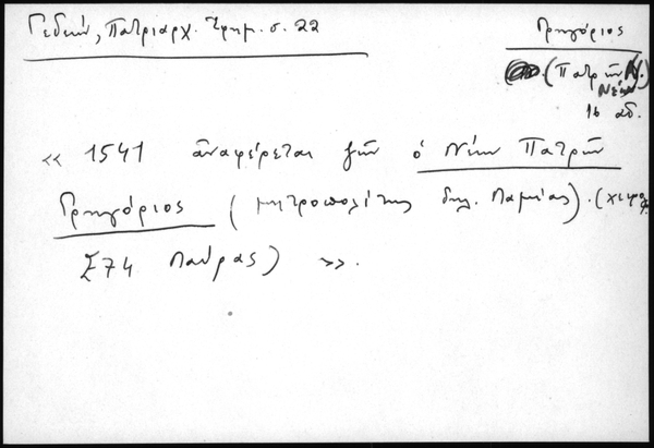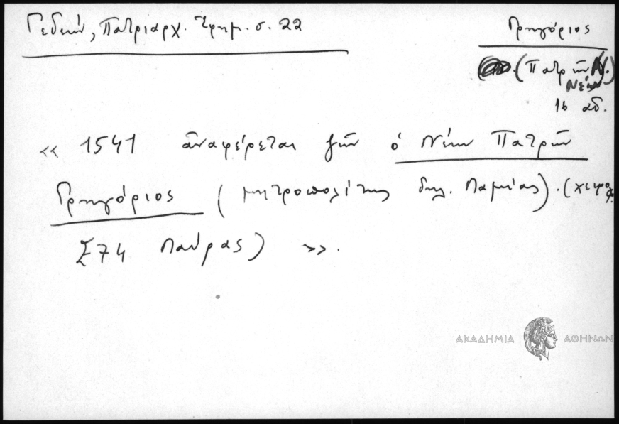 - "1541 αναφέρεται ζων ο Νέων Πατρών Γρηγόριος (μητροπολίτης δηλ. Λαμίας) (χειρογρ. Ε74 Λαύρας)"