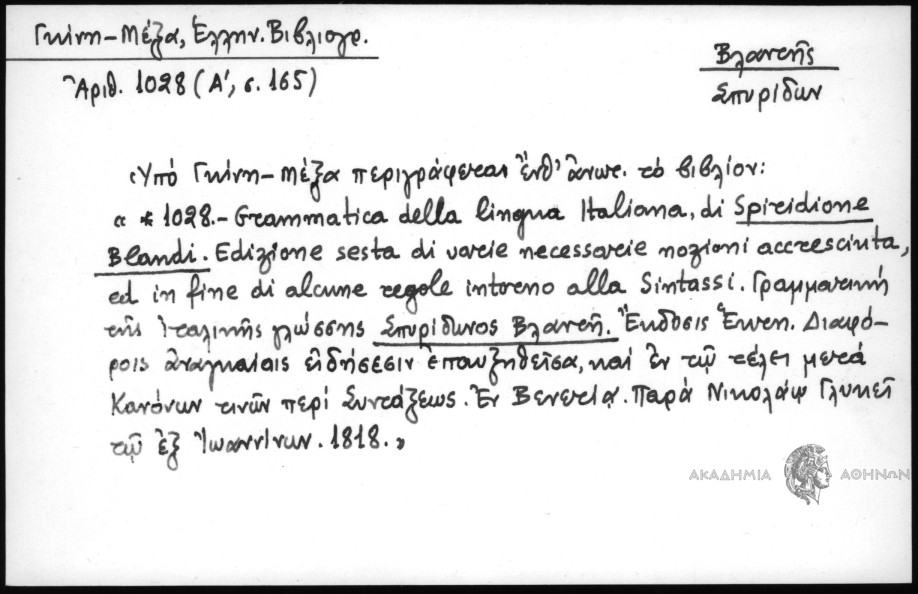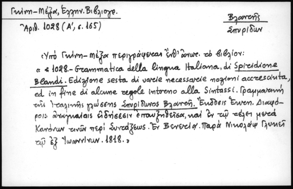 - Υπό Γκίνη - Μέξα περιγράφεται ένθ΄ ανωτ. το βιβλίον: "*1028 - Grammatica della lingua Italiana, di Spiridione Blandi. Edizione sesta di varie necessarie nocioni accrescinta, ed in fine di alcune regole intorno alla Sintassi. Γραμματική της Ιταλικής γλώσσης Σπυρίδωνος Βλαντή. Έκδοσις Έκτη. Διαφόροις αναγκαίοις ειδήσεσιν επαυξηθείσα, και εν τω τέλει μετά Κανόνων τινών περί Συντάξεως. Εν Βενετία, παρά Νικολάω Γλυκεί τω εξ Ιωαννίνων 1818".