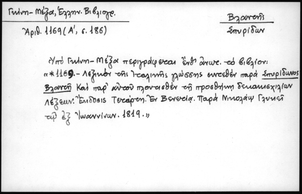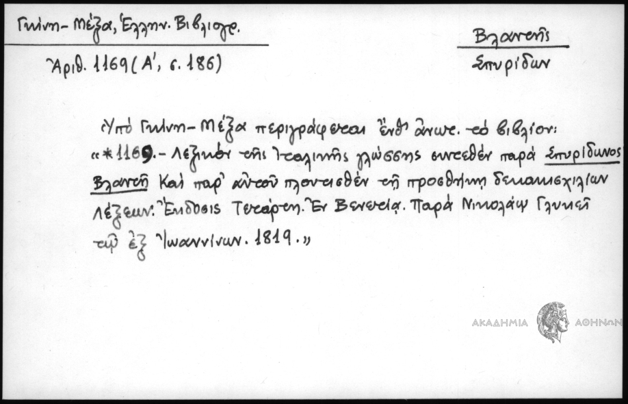 - Υπό Γκίνη - Μέξα περιγράφεται ένθ΄ ανωτ. το βιβλίον: "*1169 - Λεξικόν της Ιταλικής γλώσσης συντεθέν παρά Σπυρίδωνος Βλαντή και παρ΄ αυτού πλουτισθέν τη προσθήκη δεκακισχιλίων Λέξεων. Έκδοσις Τετάρτη. Εν Βενετία, παρά Νικολάω Γλυκεί τω εξ Ιωαννίνων, 1819"