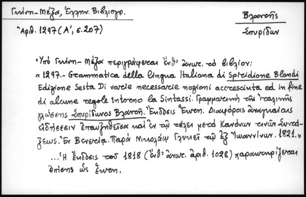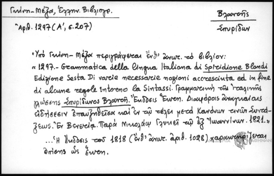- Υπό Γκίνη - Μέξα περιγράφεται ένθ΄ ανωτ. το βιβλίον: "1297 - Grammatica della lingua Italiana de Spiridione Blondi Edizione Sesta Di varie necessarie nozionei accresciuta ed in fine di alcume regole intrno la Sintassi. Γραμματική της ιταλικής γλώσσης Σπυρίδωνος Βλαντή. Έκδοσις Έκτη. Διαφόροις αναγκαίαις ειδήσεσιν επαυθηθείσα και εν τω τέλει μετά Κανόνων τινών Συντάξεως. Εν Βενετία, παρά Νικολάω Γλυκεί τω εξ Ιωαννίνων 1821" ... Η έκδοσις του 1818 (ένθ΄ ανωτ. αριθ. 1028) χαρακτηρίζεται επίσης ως έκτη.