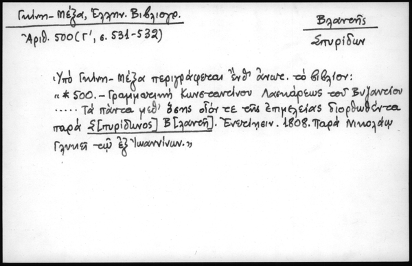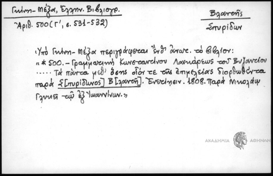 - Υπό Γκίνη - Μέξα περιγράφεται ένθ΄ ανωτ. το βιβλίον: "*500 - Γραμματική Κωνσταντίνου Λασκάρεως του Βυζαντίου... Τα πάντα μεθ΄ όσης οίον τε της επιμελείας διορθωθέντα παρά Σ[πυρίδωνος] Β[λαντή]. Ενετίησιν, 1808, παρά Νικολάω Γλυκεί τω εξ Ιωαννίνων."