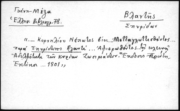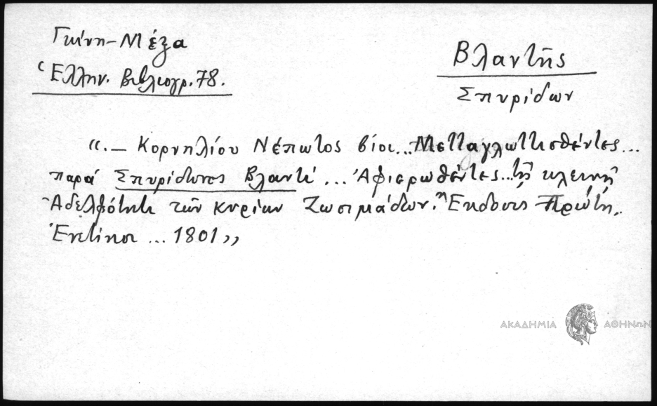 - " - Κορνηλίου Νέπωλος βίοι... Μετταγλωττισθέντες... παρά Σπυρίδωνος Βλαντί... Αφιερωθέντες... τη κλεινή Αδελφότητι των κυρίων Ζωσιμάδων. Έκδοσις Πρώτη. Ενετίησιν... 1801"