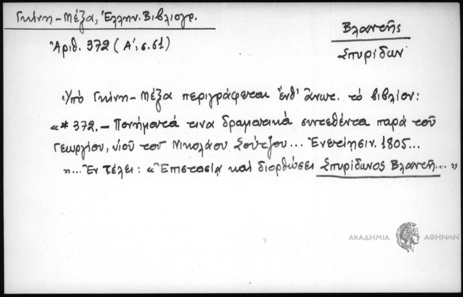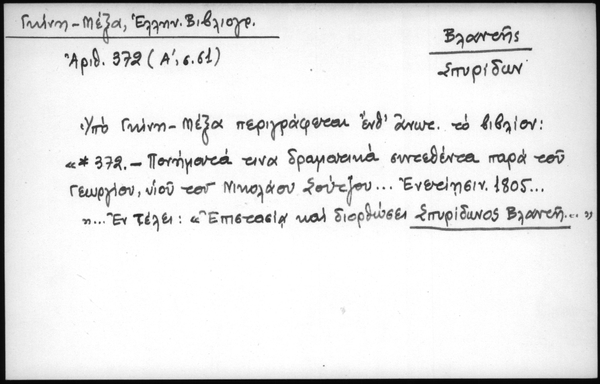 - Υπό Γκίνη - Μέξα περιγράφεται ένθ΄ ανωτ. το βιβλίον: "*372 - Πονήματά τινα δραματικά συντεθέντα παρά του Γεωργίου, υιού του Νικολάου Σούτζου... Ενετίησιν 1805..." ...Εν τέλει: "Επιστασία και διορθώσει Σπυρίδωνος Βλαντή..."