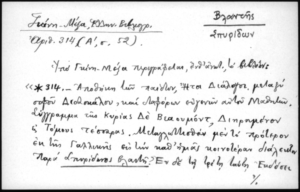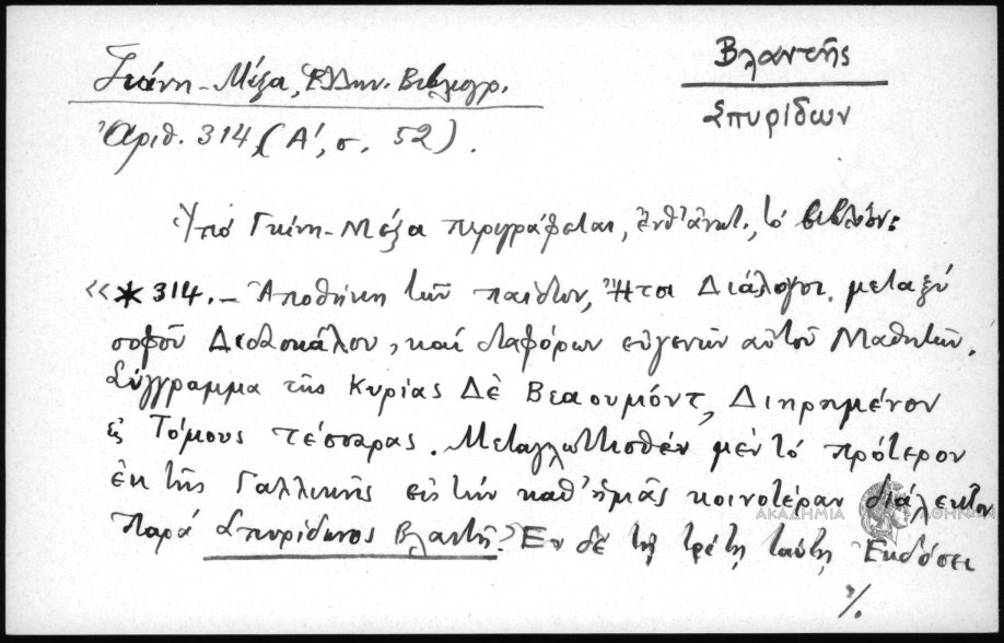 - Υπό Γκίνη - Μέξα περιγράφεται, ένθ΄ ανωτ., το βιβλίον: "*314 - Αποθήκη των παίδων, ήτοι Διάλογοι μεταξύ σοφού Διδασκάλο, και διαφόρων ευγενών αυτού Μαθητών. Σύγγραμμα της Κυρίας Δε Βεαουμόντ, Διηρημένον εις Τόμους τέσσαρας. Μεταγλωττισθέν μεν το πρότερον εκ της Γαλλικής εις την καθ΄ ημάς κοινοτέραν διάλεκτον παρά Σπυρίδωνος Βλαντή. Εν δε τη τρίτη ταύτη εκδόσει παρ΄ αυτού αυξηθέν, και μετά πλείστης επιμελείας διορθωθέν. Τόμος τέταρτος, και έσχατος. Ενετίησιν, 1805, παρά Νικολαώ Γλυκεί, τω εξ Ιωαννίνων"