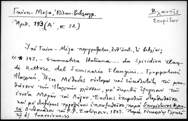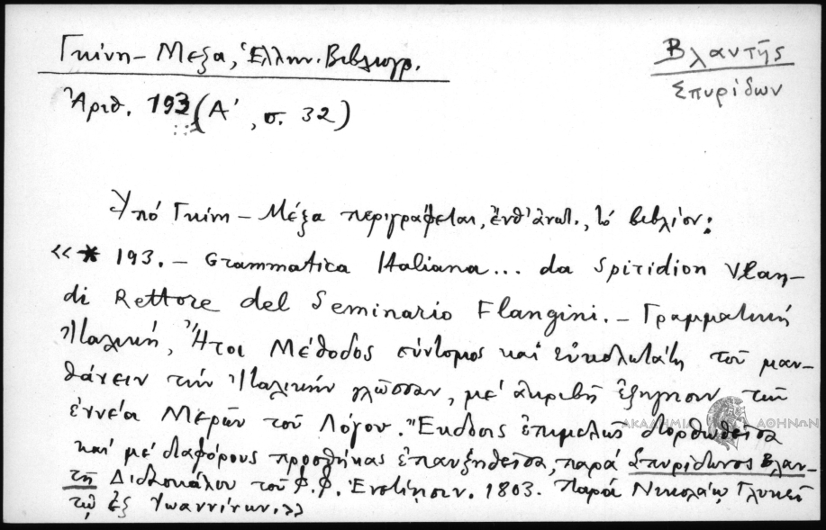 - Υπό Γκίνη - Μέξα περιγράφεται, ένθ΄ ανωτ., το βιβλίον: "*193 -Grammatica Italiana... da Spiridion Vlandi Rettore del Seminario Flangini. Γραμματική Ιταλική, Ήτοι Μέθοδος σύντομος και ευκολωτάτη του μανθάνειν την Ιταλικήν γλώσσαν, με ακριβή εξήγησιν των εννέα Μερών του Λόγου. Έκδοσις επιμελής διορθωθείσα και με διαφόρους προσθήκας επαυξηθείσα, παρά Σπυρίδωνος Βλαντή Διδασκάλου του Φ.Φ. Ενετίησιν 1803, παρά Νικολάω Γλυκεί τω εξ Ιωαννίνων".