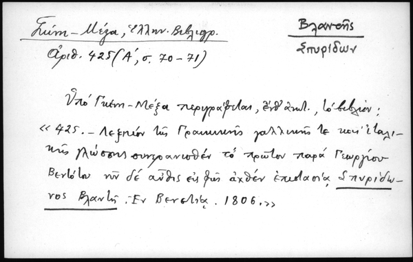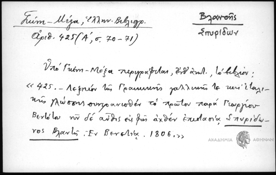 - Υπό Γκίνη - Μέξα περιγράφεται, ένθ΄ ανωτ., το βιβλίον: "425 - Λεξικόν της Γραικικής γαλλικής τε και ιταλικής γλώσσης συνερανισθέν το πρώτον παρά Γεωργίου Βεντότου νυν δε αύθις εις φως αχθέν επιστασία Σπυρίδωνος Βλαντή, εν Βενετία, 1806"