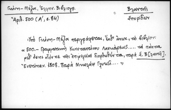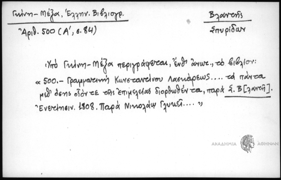 - Υπό Γκίνη - Μέξα περιγράφεται, ένθ΄ ανωτ., το βιβλίον: "500 - Γραμματική Κωνσταντίνου Λασκάρεως... τα πάντα μεθ΄ όσης οίον τε επιμελείας διορθωθέντα, παρά Σ. Β[λαντή]. Ενετίησιν 1808, παρά Νικολάω Γλυκεί..."