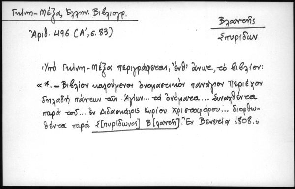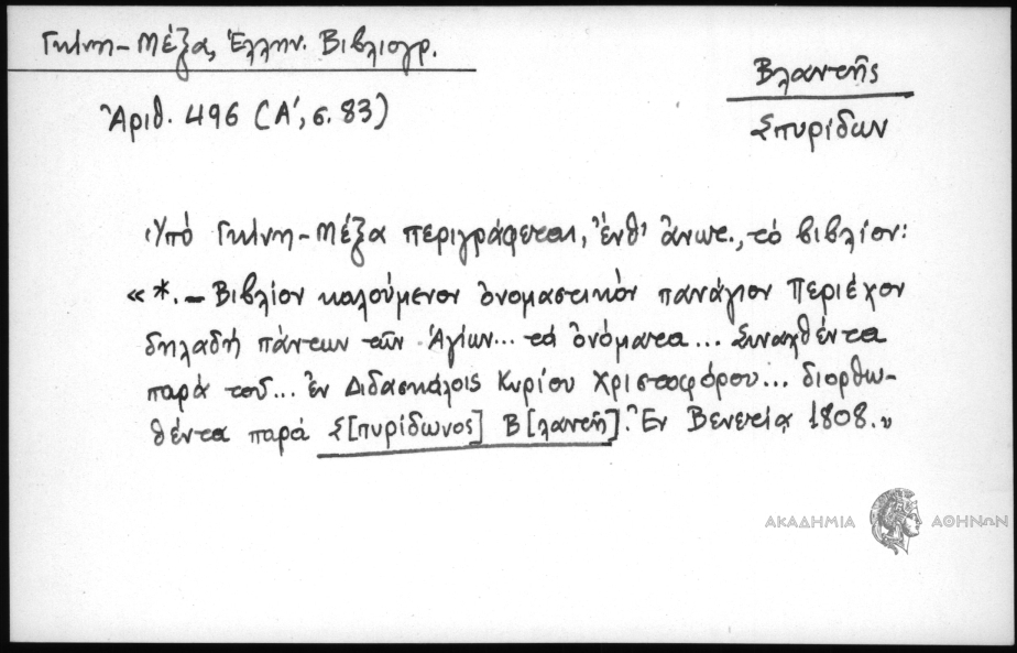 - Υπό Γκίνη - Μέξα περιγράφεται, ένθ΄ άνωτ., το βιβλίον: "* - Βιβλίον καλούμενον ονομαστικόν παναγίου περιέχον δηλαδή πάντων των Αγίων... τα ονόματα... Συναχθέντα παρά του εν Διδασκάλοις Κυρίου Χριστοφόρου... διορθωθέντα παρά Σ[πυρίδωνος] Β[λαντή], εν Βενετία 1808"
