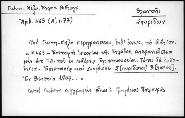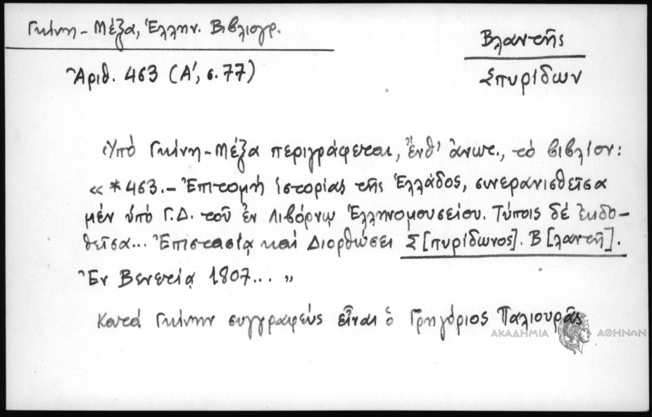 - Υπό Γκίνη - Μέξα περιγράφεται, ένθ΄ ανωτ. το βιβλίον: "*463 - Επιτομή ιστορίας της Ελλάδος, συνερανισθείσα μεν υπό Γ. Δ. του εν Λιβόρνω Ελληνομουσείου. Τύποις δε εκδοθείσα... Επιστασία και Διορθώσει Σ[πυρίδωνος] Β[λαντή]. Εν Βενετία 1807..." Κατά Γκίνην συγγραφεύς είναι ο Γρηγόριος Παλιουράς