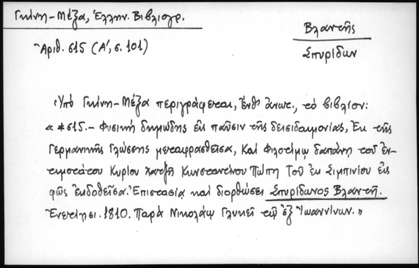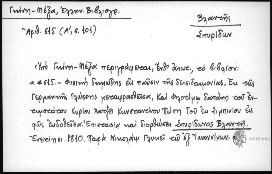 - Υπό Γκίνη - Μέξα περιγράφεται, ένθ΄ ανωτ., το βιβλίον: "*615 - Φυσική δημώδης εις παύσιν της δεισιδεμονίας, εκ της Γερμανικής Γλώσσης μεταφρασθείσα, και φιλοτίμω δαπάνη του εντιμοτάτου Κυρίου Χατζή Κωνσταντίνου Πώπη του εκ Σιμπινίου εις φως εκδοθείσα. Επιστασία και διορθώσει Σπυρίδωνος Βλαντή. Ενετίησι, 1810, παρά Νικολάω Γλυκεί τω εξ Ιωαννίνων"