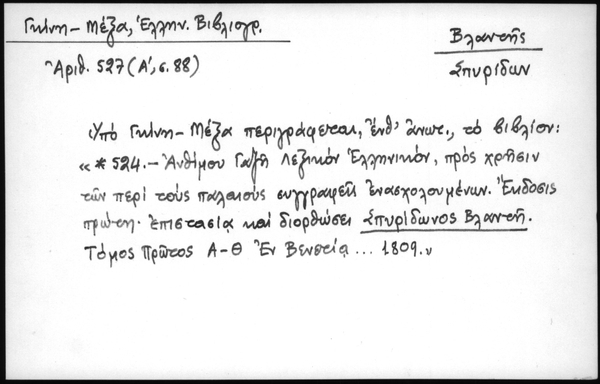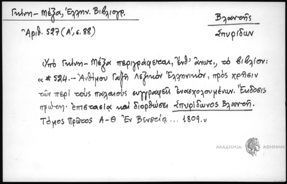 - Υπό Γκίνη - Μέξα περιγράφεται, ένθ΄ ανωτ., το βιβλίον: "*524 - Ανθίμου Γαζή Λεξικόν Ελληνικόν, προς χρήσιν των περί τους παλαιούς συγγραφείς ενασχολουμένων. Έκδοσις πρώτη, επιστασία και διορθώσει Σπυρίδωνος Βλαντή. Τόμος πρώτος Α - Θ Εν Βενετία... 1809"