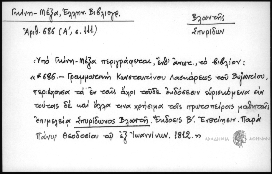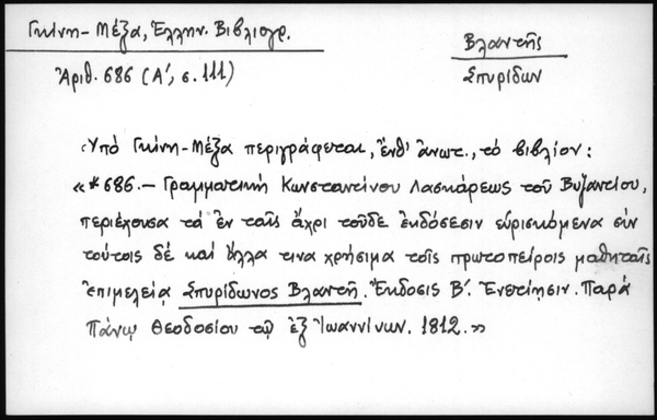 - Υπό Γκίνη - Μέξα περιγράφεται, ένθ΄ ανωτ., το βιβλίον: "*686 - Γραμματική Κωνσταντίνου Λασκάρεως του Βυζαντίου, περιέχουσα τα εν ταις άχρι τούδε εκδόσεσιν ευρισκόμενα συν τούτοις δε και άλλα τινα χρήσιμα τοις πρωτοπείροις μαθηταίς επιμελεία Σπυρίδωνος Βλαντή. Έκδοσις Β΄. Ενετίησιν, παρά Πάνω Θεοδοσίου τω εξ Ιωαννίνων, 1812"