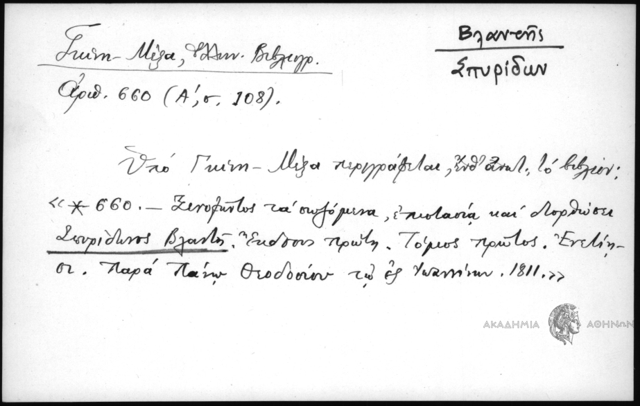 - Υπό Γκίνη - Μέξα περιγράφεται, ένθ΄ ανωτ., το βιβλίον: "* 660 - Ξενοφώντος τα σωζόμενα, επιστασία και διορθώσει Σπυρίδωνος Βλαντή. Έκδοσις πρώτη. Τόμος πρώτος. Ενετίησι, παρά Πάνω Θεοδοσίου τω εξ Ιωαννίνων 1811"