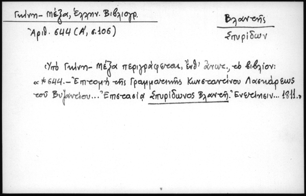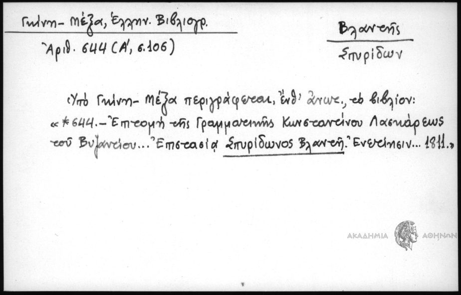 - Υπό Γκίνη - Μέξα περιγράφεται, ένθ΄ ανωτ., το βιβλίον: "*644 - Επιτομή της Γραμματικής Κωνσταντίνου Λασκάρεως του Βυζαντίου... Επιστασία Σπυρίδωνος Βλαντή. Ενετίησιν... 1811"