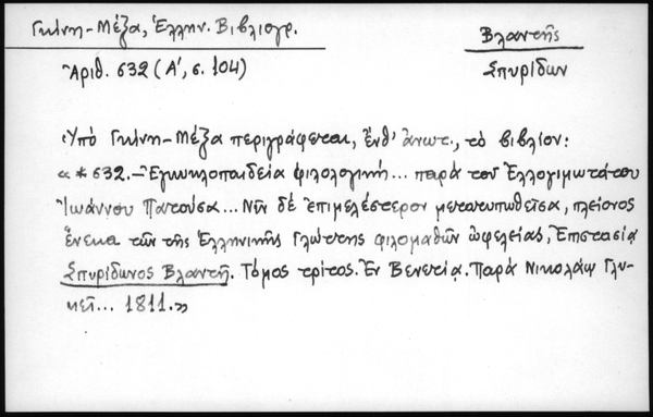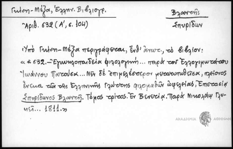 - Υπό Γκίνη - Μέξα περιγράφεται, ένθ΄ ανωτ., το βιβλίον: "632 - Εγκυκλοπαίδεια φιλολογική... παρά του Ελλογιμωτάτου Ιωάννου Πατούσα... Νυν δε επιμελέστερον μετατυπωθείσα, πλείονος ένεκα των της Ελληνικής Γλώττης φιλομαθών ωφελείας, επιστασία Σπυρίδωνος Βλαντή. Τόμος τρίτος. Εν Βενετία. Παρά Νικολάω Γλυκεί... 1811"