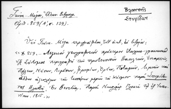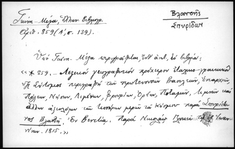 - Υπό Γκίνη - Μέξα περιγράφεται, ένθ΄ ανωτ., το βιβλίον: "* 859 - Λεξικόν γεωγραφικόν πρόχειρον ιταλικο-γραικικόν Ή Σύντομος περιγραφή των πρωτευουσών Βσιλειών, Επαρχιών, Πόλεων, Νήσων, Λιμένων, Φρουρίων, Ορέων, Ποταμών, Λιμνών και άλλων αξιολόγων των τεσσάρων μερών του Κόσμου παρά Σπυρίδωνος Βλαντή. Εν Βενετία, παρά Νικολάω Γλυκεί τω εξ Ιωαννίνων, 1815"