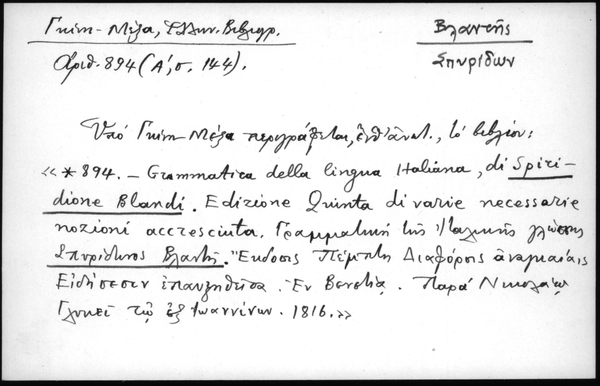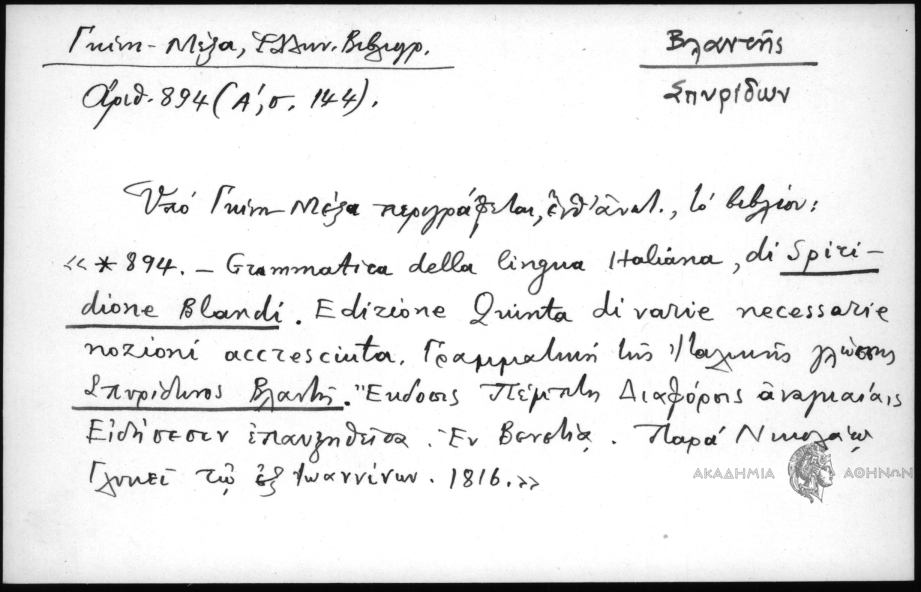 - Υπό Γκίνη - Μέξα περιγράεται, ένθ΄ ανωτ., το βιβλίον: "*894 - Grammatica della lingua Italiana, di Spiridione Blandi. Edizione Quinta di varie necessarie nozioni accresciuta. Γραμματική της Ιταλικής γλώσσης Σπυρίδωνος Βλαντή. Έκδοσις Πέμπτη. Διαφόροις αναγκαίαις ειδήσεσιν επαυξηθείσα. Εν Βενετία, παρά Νικολάω Γλυκεί τω εξ Ιωαννίνων, 1816