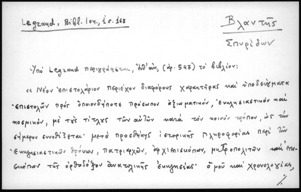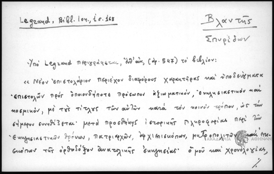 - Υπό Legrand περιγράφεται, ένθ΄ ανωτ., (αρ. 547) το βιβλίον: "Νέον επιστολάριον περιέχον διαφόρους χαρακτήρας και υποδείγματα επιστολών προς οποιονδήποτε πρόσωπον αξιωματικόν, εκκλησιαστικόν και κοσμικόν, με τους τίτλους των αυτών κατά τον κοινόν τρόπον, ως την σήμερον συνηθίζεται, μετά προσθήκης ιστορικής πληροφορίας περί των εκκλησιαστικών θρόνων, πατριαρχών, αρχιεπισκόπων, μητροπολιτών και επισκόπων της ορθοδόξου ανατολικής εκκλησίας. Ομού και χρονολογίας, μηνολογίου και χρησίμων κανονίων πρί των πασχαλίων, και άλλων αναγκαίων νεωστί προστεθέντων, μετά αστερίσκου, ως εν τω πίνακι φαίνονται. Τα πάντα διορθωθέντα παρά Σ. Β. δ. του φ.φ. αψϟζ΄. Ενετίησιν 1797, παρά Νικολάω Γλυκεί τω εξ Ιωαννίνων. Εις 8ον, σελ. 240 - Τα αρχικά Σ. Β. σημαίνουν Σπυρίδων Βλαντής.
