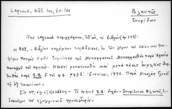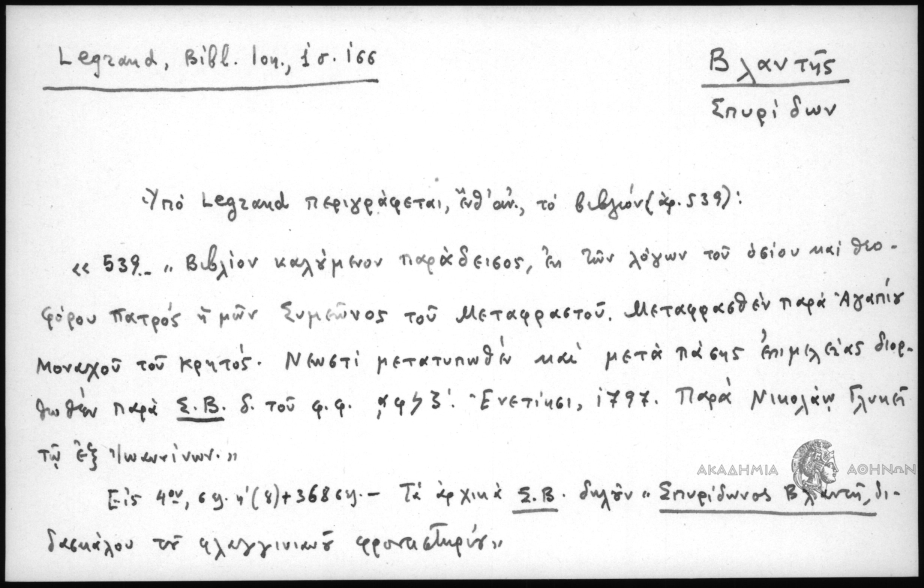 - Υπό Legrand περιγράφεται, ένθ΄ ανωτ., το βιβλίον (αρ. 539): "539 - "Βιβλίον καλούμενον παράδεισος, εκ των λόγων του οσίου και θεοφόρου πατρός ημών Συμεώνος του Μεταφραστού. Μεταφρασθέν παρά Αγαπίου Μοναχού του Κρητός. Νεωστί μετατυπωθέν και μετά πάσης επιμελείας διορθωθέν παρά Σ. Β. δ. του φ.φ. αψϟζ΄. Ενετίησι, 1797, παρά Νικολάω Γλυκεί τω εξ Ιωαννίνων" Εις 4ον, σελ. η΄(8) + 368 σελ. - Τα αρχικά Σ. Β. δηλούν "Σπυρίδωνος Βλαντή, διδασκάλου του φλαγγινιανού φροντιστηρίου"