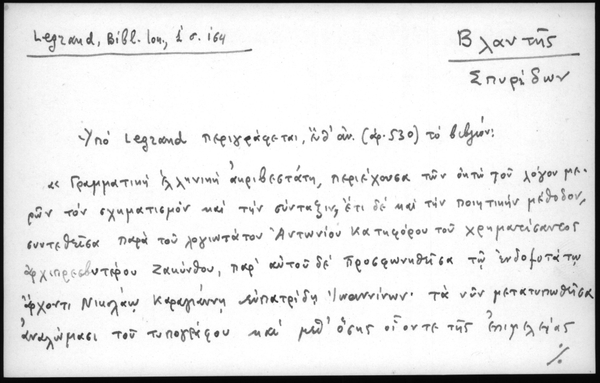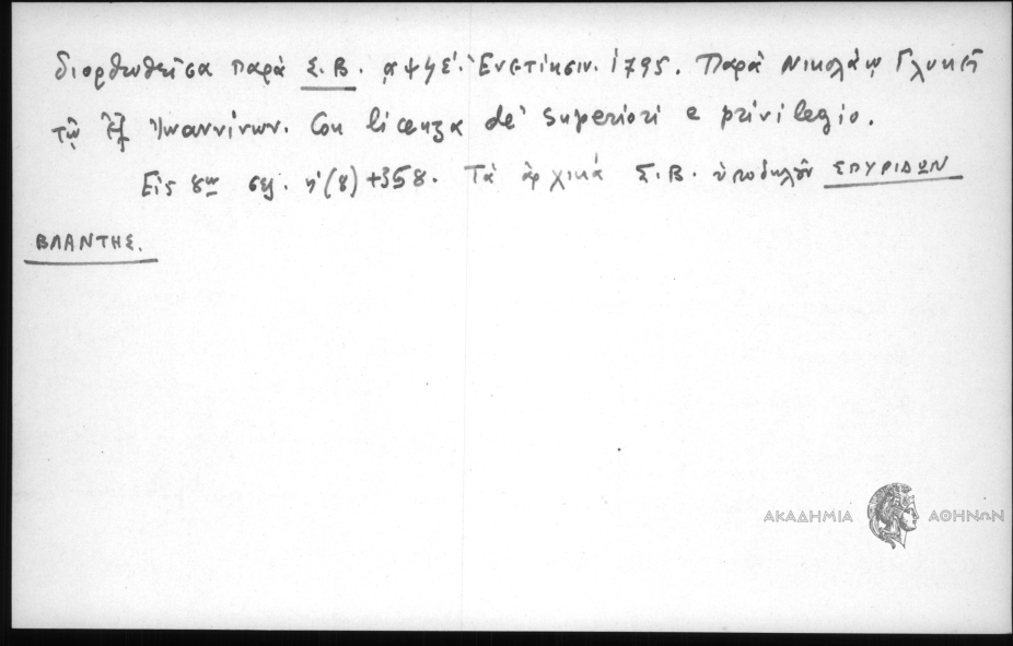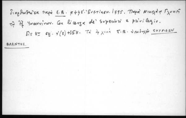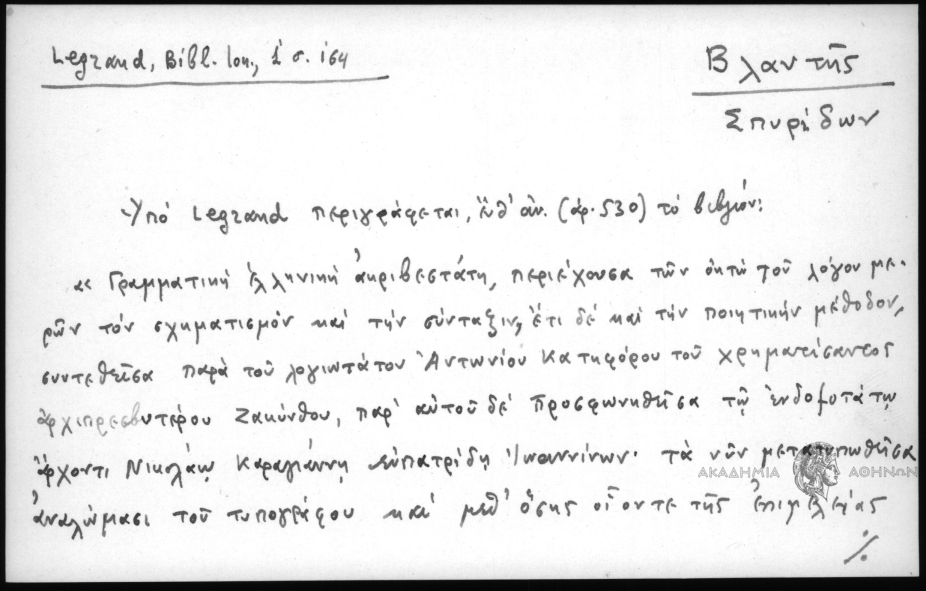 - Υπό Legrand περιγράφεται, ένθ΄ ανωτ. (αρ. 530) το βιβλίον: "Γραμματική ελληνική ακριβεστάτη, περιέχουσα την οκτώ του λόγου μερών τον σχηματισμόν και την σύνταξιν, έτι δε και την ποιητικήν μέθοδον, συντεθείσα παρά του λογιωτάτου Αντωνίου Κατηφόρου του χρηματίσαντος αρχιπρεσβυτέρου Ζακύνθου, παρ΄ αυτού δε προσφωνηθείσα τω ενδοξοτάτω άρχοντι Νικολάω Καραγιάννη ευπατρίδη Ιωαννίνων. Τα νυν μετατυπωθείσα αναλώμασι του τυπογράφου και μεθ΄ όσης οίον τε της επιμελείας διορθωθείσα παρα Σ. Β. αψϟε΄. Ενετίησιν 1795. Παρά Νικολάω Γλυκεί τω εξ Ιωαννίνων. Con licenza de Superiori e privilegio. Εις 8ον σελ. η΄(8) + 358. Τα αρχικά Σ. Β. υποδηλούν Σπυρίδων Βλαντής.