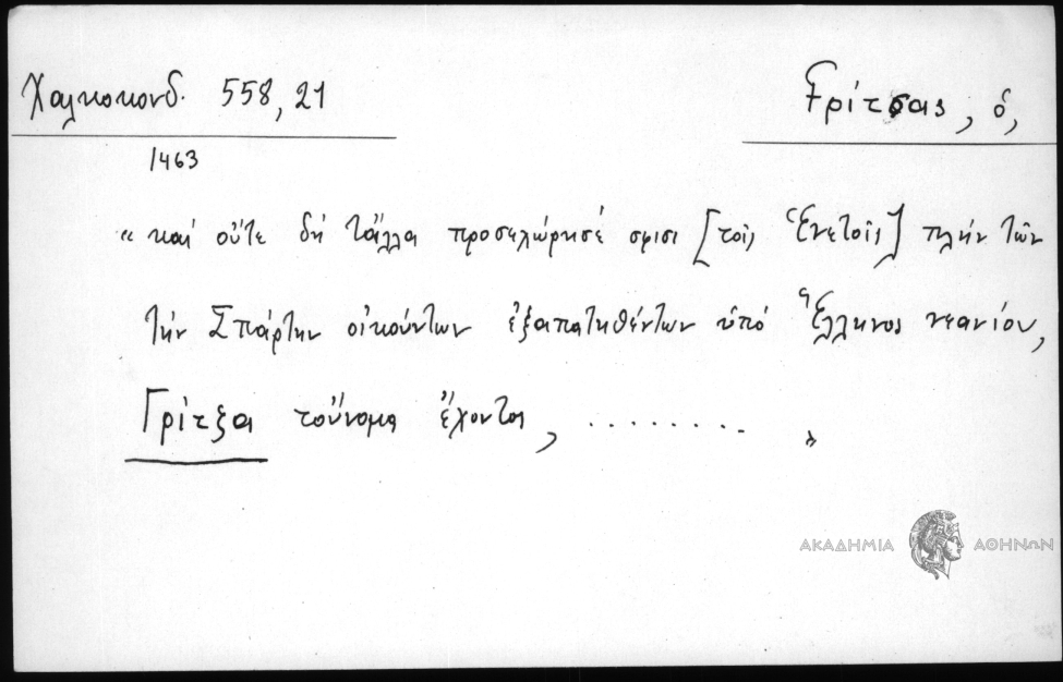 - "και ούτε δη τάλλα προσελήρησέ σφισι [τους Ενετοίς] πλην των την Σπάρτην οικούντων εξαπατηθέντων υπό Έλληνος νεανίου, Γρίτζα τούνομα έχοντος,..."