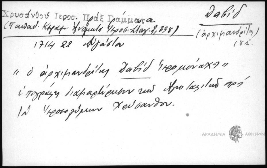 - "ο αρχιμανδριτης Δαβίδ ιερομόναχος" υπογράφει διαμαρτύρησιν των Αγιοτιφιτών νπρος τον Ιεροσολύμων Χρύσανθον