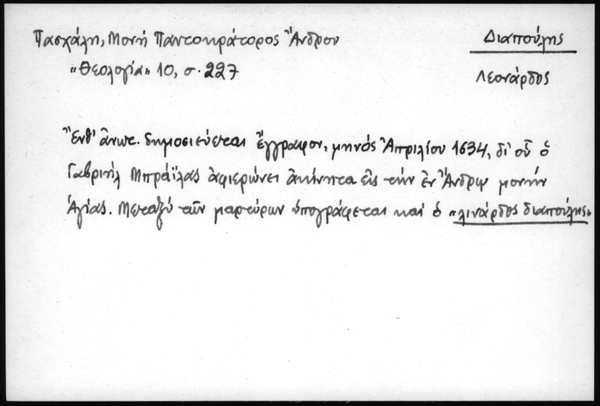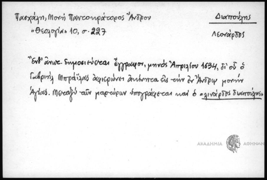 - Ένθ΄ανωτ. δημοσιεύεται έγγραφον, μηνός απριλίου 1634, δι΄ου ο Γαβριήλ Μπράϊλας αφιερώνει ακίνητα εις την εν Άνδρω μονήν Αγίας. Μεταξύ των μαρτύρων υπογράφεται και ο "λινάρδος διαπούλης".