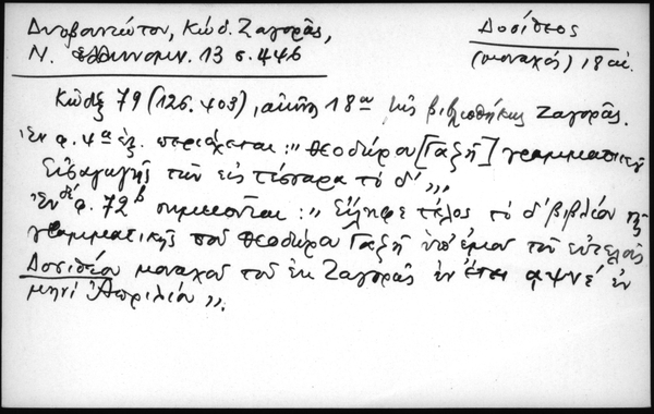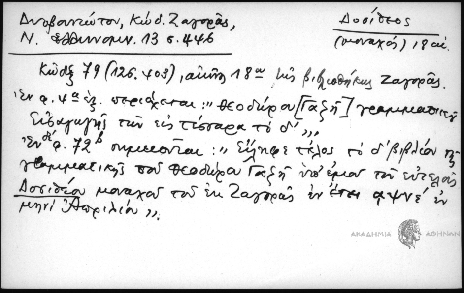 - Κώδιξ 79 (126.403), αιώνος 18ου της βιβλιοθήκης Ζαγοράς. εν φ. 4α εξ περιέχεται: "Θεοδώρου [Γαζή] γραμματικού Εισαγωγής των εις τέσσαρα το δ΄". Εν δε φ. 72β σημειούται: "Είληφε τέλος το δ΄βιβλίον της γραμματικής του Θεοδώρου Γαζή υπ΄εμού του ευτελούς Δοσιθέου μονάχου του εκ Ζαγοράς εν έτει αψνε΄εν μηνί Απριλίου".