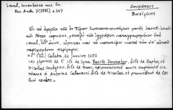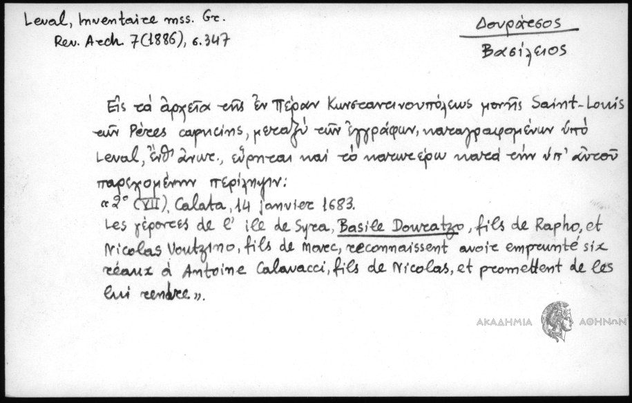 - Εις τα αρχεία της εν Πέραν Κωνσταντινουπόλεως μονής Saint-Louis των Peres capucins, μεταξύ των εγγράφων, καταγραφομένων υπό Leval, ενθ΄ανωτ., εύρηται και το κατωτέρω κατά την υπ΄αυτού περιεχομένην περίληψιν: "2ο (VII), Galata, 14 janvier 1683. Les γέροντες de l΄ile de Syra, Basile Douratzo, fils de Rapho, et Nicolas Voutzino, fils de Marc, reconnaissent avoir emprunte six reaux a Antoine Calavacci, fils de Nicolas, et promettent de les lui rendre".