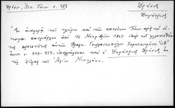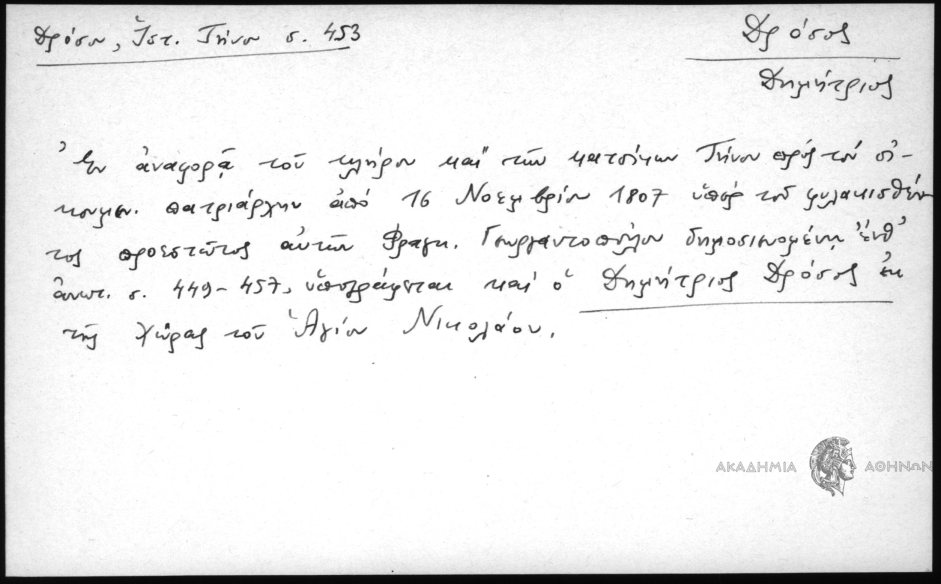 - Εν αναφορά του κλήρου και των κατοίκων Τήνου προς τον οικουμεν. πατριάρχην από 16 Νοεμβρίου 1807 υπέρ του φυλακισθέντος προεστώτος αυτών Φραγκ. Γεωργαντοπούλου δημοσιευομένη ένθ΄ανωτ. σ. 449-457, υπογράφεται και ο Δημήτριος Δρόσος εκ της χώρας του Αγίου Νικολάου.