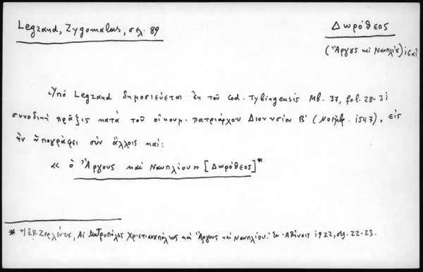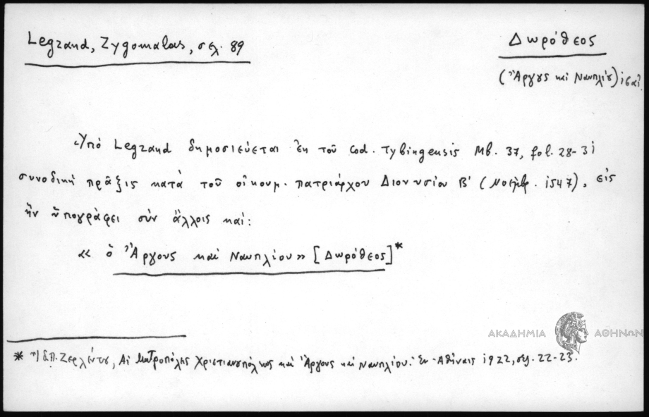 - Υπό Legrand δημοσιεύεται εκ του Cod. Tybingensis Mb.37, fol 28-31 συνοδική πράξις κατά του οικουμ. πατριάρχου Διονυσίου Β΄(Νοέμβρ. 1547), εις ην υπογράφει συν άλλοις και: "ο Άργους και Ναυπλίου" [Δωρόθεος]* *Ίδ. Π.Ζερλέντου, Αι Μητροπόλεις Χριστιανουπόλεως και Άργους και Ναυπλίου. Εν Αθήναις 1922,σελ. 22-23.