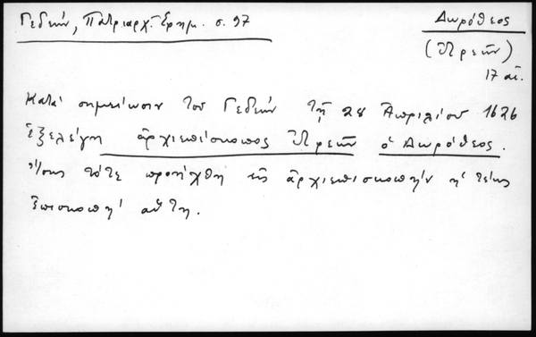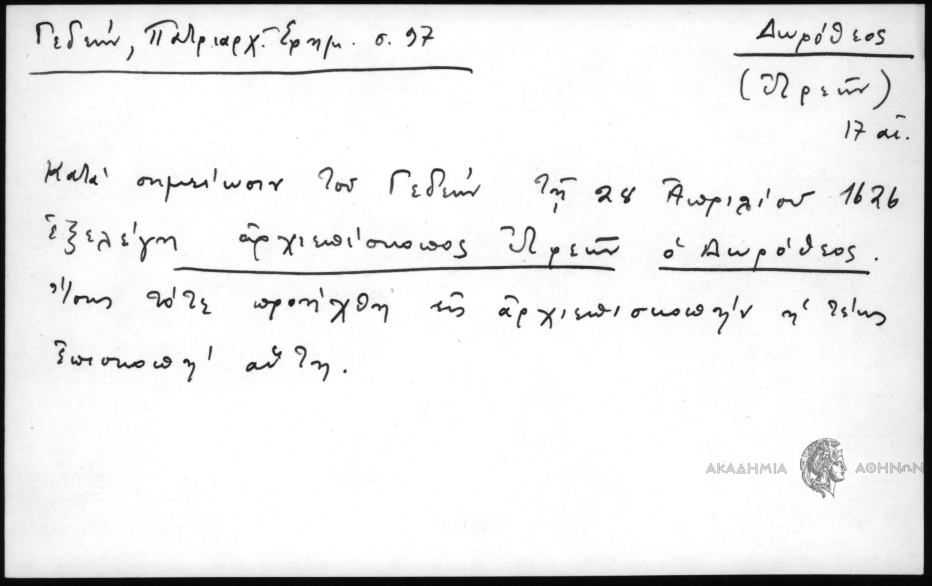 - Κατά σημείωσιν του Γεδεών τη 28 Απριλίου 1626 εξελέγη αρχιεπίσκοπος Ωρεών ο Δωρόθεος. Ίσως τότε προήχθη εις αρχιεπισκοπήν η τέως επισκοπή αύτη.