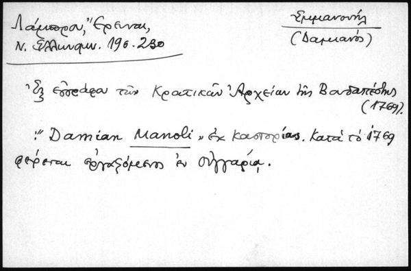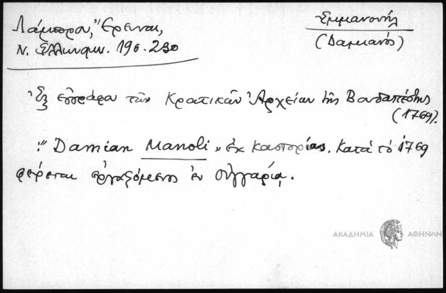 - Εξ εγγράφου των Κρατικών Αρχείων της Βουδαπέστης (1769). :"Damian Manoli" εκ Καστορίας. Κατά το 1769 φέρεται εργαζόμενος εν Ουγγαρία.