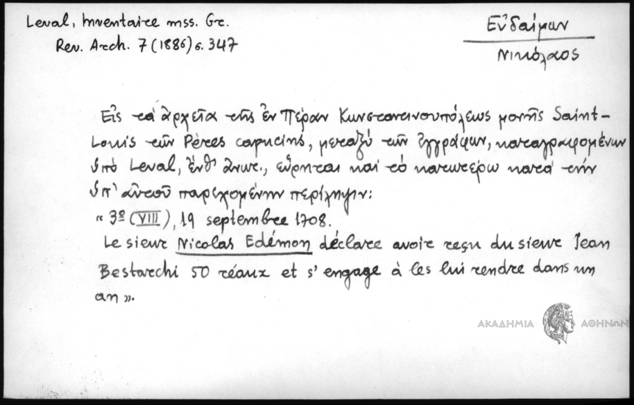 - Εις τα αρχεία της εν Πέραν Κωνσταντινουπόλεως μονής Saint - Louis των Peres capucins, μεταξύ των εγγράφων, καταγραφομένων υπο Leval, ενθ' ανωτ., εύρηται και το κατωτέρω κατά την υπ' αυτού παρεχομένην περίληψιν: " 3ο (VIII), 19 septembre 1708. Le sieur Nicolas Edemon declare avoir recu du sievve Jean Bestaurchi 50 reaux et s' engage a les lui rendre dans un an".