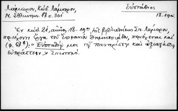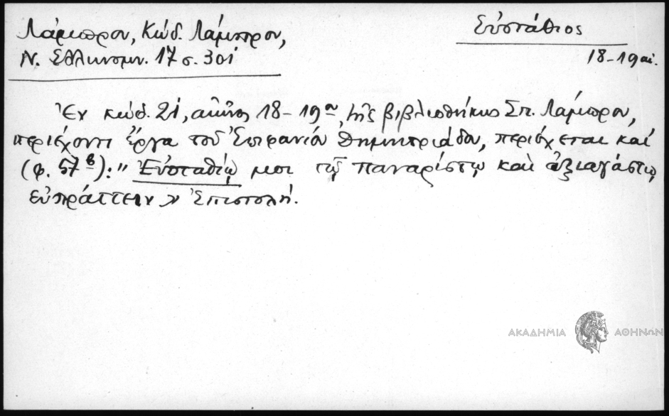 - Εν κώδ. 21, αιώνος 18-19ου, της βιβλιοθήκης Σπ. Λάμπρου, περιέχοντι έργα του [Στεφανίου] Δημητριάδου, περιέχεται και (φ. 57/β): "Ευσταθίω μοι τω παναρίστω και αξιαγάστω ευπράττειν" επιστολή.