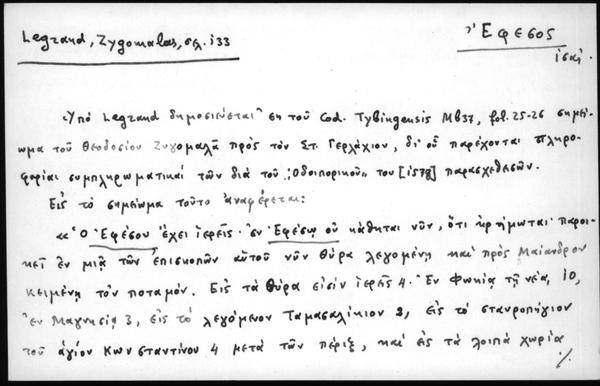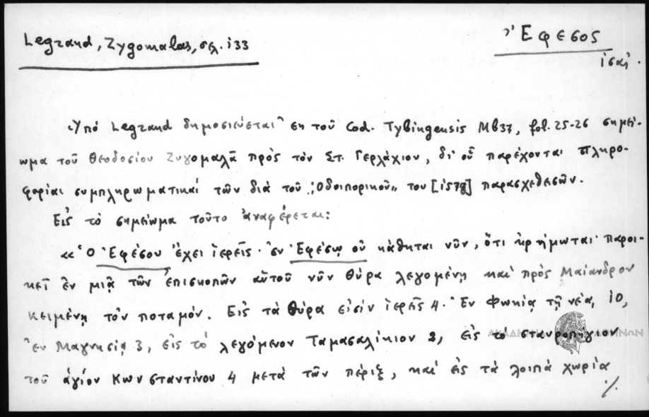 - Υπο Legrand δημοσιεύεται εκ του Cod. Tybingeusis Mb37, fo. 25-26 σημείωμα του Θεοδοσίου Ζυγομαλά προς τον Στ. Γερλάχιον, δι' ου παρέχονται πληροφορίαι συμπληρωματικαί των δια του ; Οδοοπορικού" του [1578] παρασχεθεισών. Εις το σημείωμα τούτο αναφέρεται: " Ο Εφέσου έχει ιερείς · εν Εφέσεω ου κάθηται νυν, οτι κρήμωται · παροικεί εν μια των επισκοπών αυτού νυν θύρα λεγομένη και προς Μαίανδρον κειμένη τον ποταμόν. Εις τα θύρα εισίν ιερέις 4. Εν Φωκία τη νέα 10, εν Μαγνησία 3, εις το λεγόμενον Ταμασαλίκιον 2, εις το σταυροπήγιον του αγίου Κωνσταντίνου 4 μετά των πέριξ, και εις τα λοιπά χωριά ανα 1 και 2 ιερείς, εως 40 ή πλέον, ή και έλαττον εσθ'οτε. Πλήθος χριστιανών, οίμαι, εως 1.000 οσπίτια · εισί και ξένοι έτερα τόσα, οικούντες και μετοικούντες εν ταις χώραις πάσης της επαρχίας. "