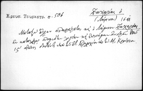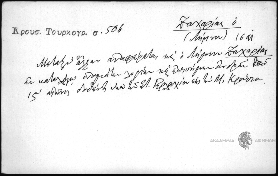 - Μεταξύ άλλων αναφέρεται κ΄ ο Λήμνου Ζαχαρίας εν καταλόγω ονομάτων λογίων κ΄επισήμων ανδρών ιϚʹ αιώνος δοθέντο υπό του Στ. Γερλαχίου εις την Μ. Κρούσιαν.
