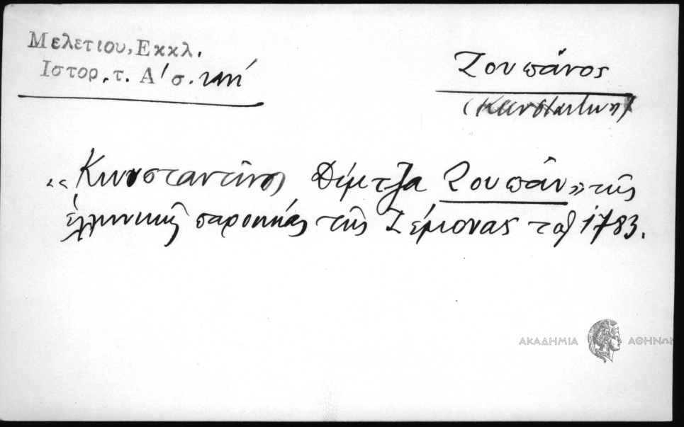 Εκκλησιαστική ιστορία Μελετίου μητροπολίτου Αθηνών. Μετενεχθείσα εκ της ελληνικής εις την ημετέραν απλοελληνικήν φράσιν εις τόμους τρεις... πλουτισθείσα με ... υποσημειώσεις και ... πίνακας παρά Γεωργίου Βενδότη εκ Ζακύνθου... νυν πρώτον τύποις εκδοθείσα δι΄ επιστασίας... Πολυζώη Λαμπανιτζιώτη του ε…