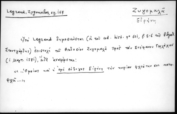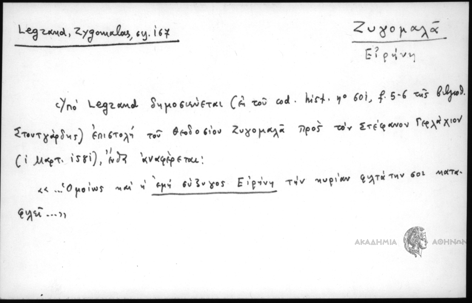 - Υπο Legrand δημοσιεύεται (εκ του cod. hist. no 601, f. 5-6 της βιβλιοθ. Στουτγάρδης) επιστολή του Θεοδοσίου Ζυγομαλά προς τον Στέφανον Γερλάχιον (1 Μαρτ. 1581), ένθα αναφέρεται: «... Όμοιως και η εμή σύζυγος Ειρήνη την κυρίαν φιλτάτην σου καταφυλεί...»