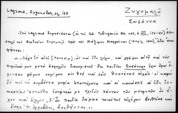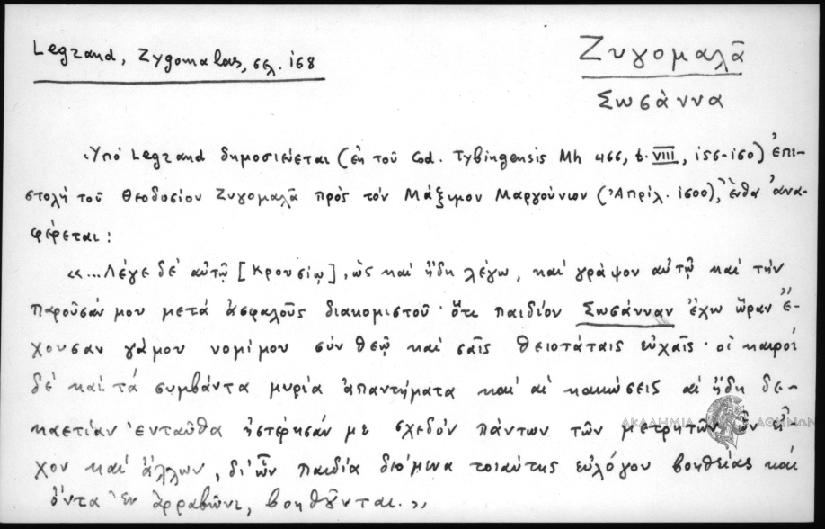 - Υπο Legrand δημοσιεύεται (εκ του Cod. Tybingensis Mh 466, t. VIII, 156-160) επιστολή του Θεοδοσίου Ζυγομαλά προς τον Μάξιμον Μαρκούνιον (Απριλ. 1600), ένθα αναφέρεται: «.. Λέγε δε αυτώ [Κρουσίω], ως και ήδη λέγω, και γράψον αυτώ και την παρουσαν μου μετά ασφαλούς διακομιστού· οτι παιδίον Σωσάνναν έχω ώραν έχουσαν γάμου νομίμου συν Θεώ και σαις θειοτάταις ευχαίς· οι καιροί δε και τα συμβάντα μυρία απαντήματα και αι κακώσεις αι ηδή δεκαετίαν ενταύθα ηστέρησαν με σχεδόν πάντων των μετρητών ων είχον και άλλων, δι ων παιδιά δεόμενα τοιαύτης ευλόγου βοηθείας και όντα εν αρραβώνι, βοηθούνται.»