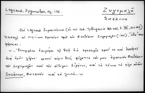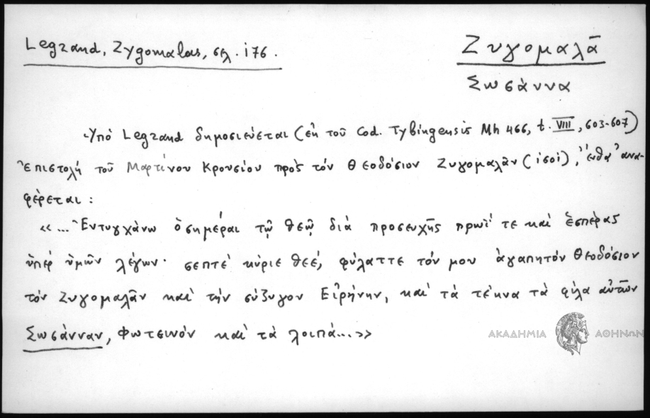 - Υπο Legrand δημοσιεύεται (εκ του Cod. Tybingensis Mh 466, t. VIII, 603-607) επιστολή του Μαρτίνου Κρουσίου προς τον Θεοδόσιον Ζυγομαλάν (1601), ένθα αναφέρεται: «...Εντυγχάνω οσημέραι τω Θεώ δια προσευχής πρωί τε και εσπέρας υπέρ υμών λέγων· σεπτέ κύριε Θεέ, φύλαττε τον μου αγαπητόν Θεοδόσιον τον Ζυγομαλάν και την σύζυγον Ειρήνην, και τα τέκνα τα φίλα αυτών Σωσάνναν, Φωτεινόν και τα λοιπά...»