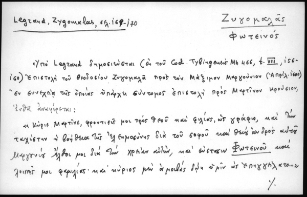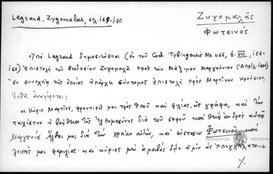 - Υπο Legrand δημοσιεύεται (εκ του Cod. Tybingensis Mh 466, t. VIII, 156-160) επιστολή του Θεοδοσίου Ζυγομαλά προς τον Μάξιμον Μαργούνιον (Απριλ. 1600) εν συνεχεία της οποίας υπάρχει σύντομος επιστολή προς Μαρτίνον Κρούσιον, ένθα αναφέρεται: «Κύριε Μαρτίνε, φροντιείς μοι προς θεού και φιλίας, ως γράφω, και την ταχίστην η βοήθεια της ελεημοσύνης δια του σοφού και θεού ανδρός αυτού Μαργουνίου έλθοι μοι δια την χρείαν αυτών, και σύστασιν Φωτεινού και λοιπής μοι φαμίλιας· και κύριος μεν αμοιβάς δώη υμίν ως επηγγείλατο...» Και εν υστερογράφω σημειούται: «Χρη ζω δια Φωτεινόν υιόν μου και σου τω αγίω πνεύματι βιβλίων τούτων· Ασιόδου μετ' εξηγήσεων, και Λιβανίου μελέτας. Λυκόφρονος μετ' εξηγήσεως και των Τζέτζου ιστοριών τνω δια πολιτικών στίχων. Σουϊδα Λεξικόν και Μέγα Ετυμολογικόν. »Και ο πέμψας αντιδώρον τεύξεται μοι και θείας αμοιβής»